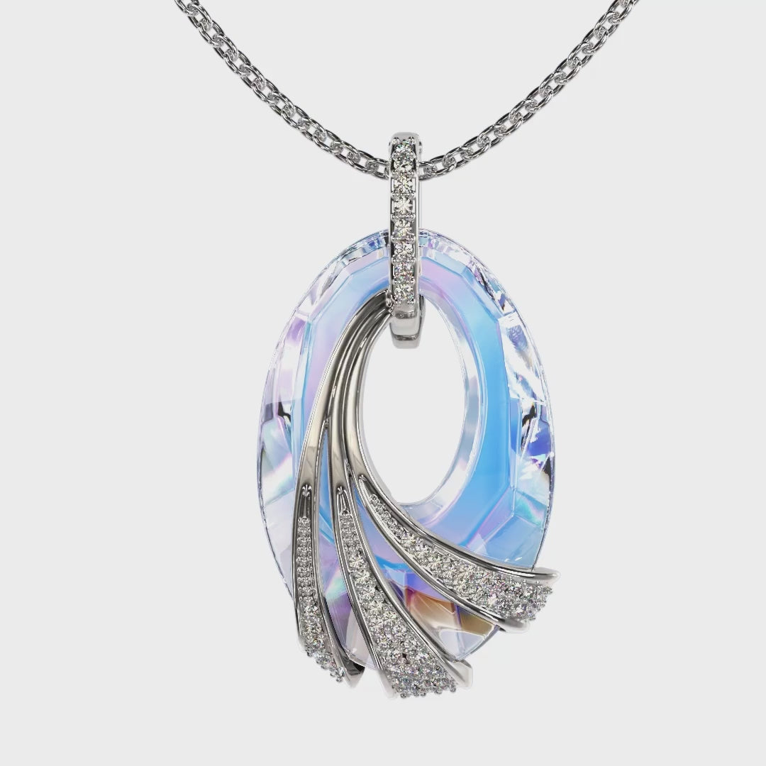 Laitoimme "meren" "kristalliin"! Ota hetki aikaa ja nauti tämän lumoavan lausekappaleen henkeäsalpaavasta viehätyksestä. Löydät sen kauneuden suorastaan lumoavaksi... ja se on vasta alkua. Jatkuvasti muuttuva sateenkaari kimaltelevaa valoa silmiinpistävissä pastellisävyissä, vangittuna upeaan Aurora Borealis -kristalliin, joka on myös asetettu yli 60 Diamonisse-kivellä! Tämä riipus herättää varmasti ihailevia katseita.